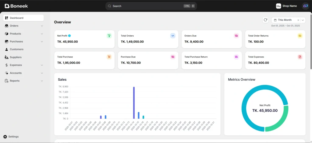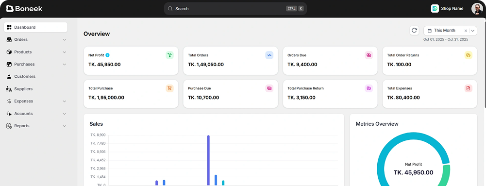 Boneek is a smart all-in-one platform that lets you manage your entire business from one dashboard — including orders, inventory, billing, expenses, and reports. No matter where your sales come from — website, shop, or social media — you can track and control everything in one place.